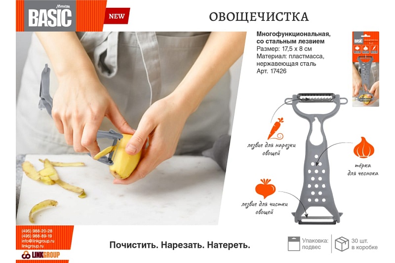 АкцияОвощечистка многофункциональная со стальным лезвием 17,5*8 см серая BASIC Marmiton 17426 (30/1)Артикул: 114393Нет в наличии59 ₽78 ₽ Действует до 03.12.2025