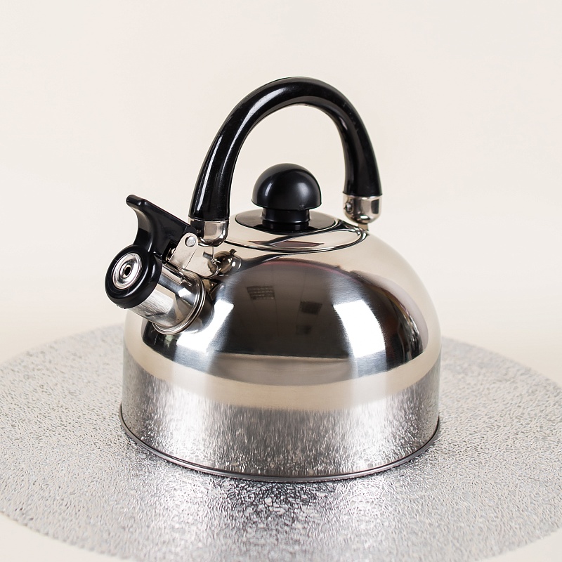 Данная модель чайника объемом 2,5 литра со свистком подходит для всех видов плит, включая индукционные. Изделие выполнено из высококачественной нержавеющей стали, что гарантирует долговечность и прочность даже при ежедневном использовании. Чайник оснащен удобной подвижной ручкой черного цвета и рычагом для открывания носика.