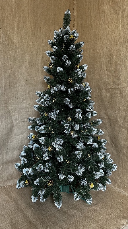 Ель «Кармен» высотой 150 сантиметров зеленого цвета на пластиковой опоре. Ее иголки изготовлены из пленки ПВХ. Кончики окрашены «под снег», имеет красивую острую коническую форму, расширяется к основанию, пышная. Добавлены шишки с позолотой и декоративные ягоды. Упакована в прочную коробку из картона, в которой можно хранить елку между праздниками.
