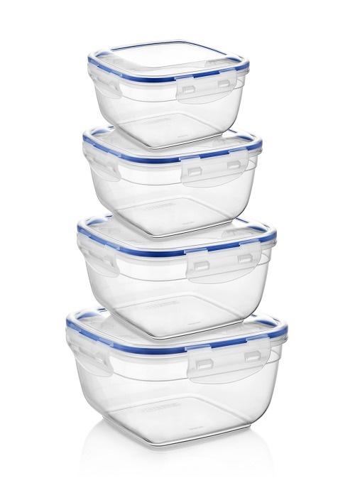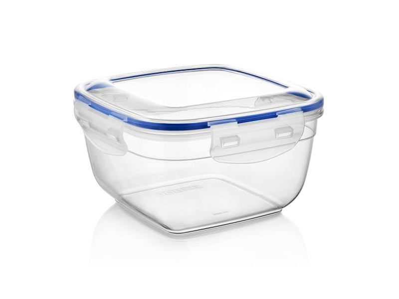 Квадратный скругленный контейнер: 1,5 л (17х9,5 см). Материал: корпус и крышка из прозрачного пластика, синий силиконовый уплотнитель. Подходит для посудомоечной машины и разогрева в микроволновой печи (без крышки).