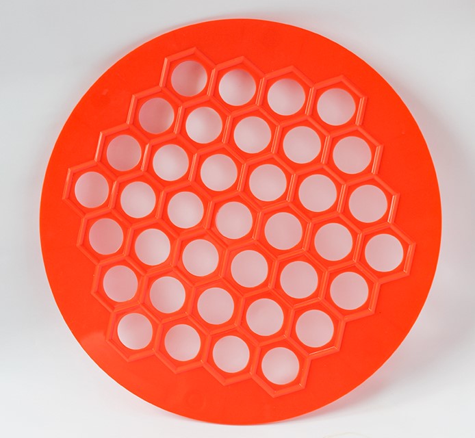 27,5см, высота 14мм, диаметр отверстий 25мм, количество отверстий 37