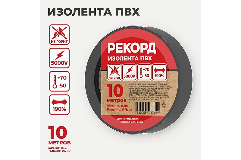 Изолента ПВХ РЕКОРД 15мм*10м*0,13мм черный 24398 (250/10)