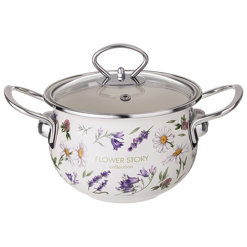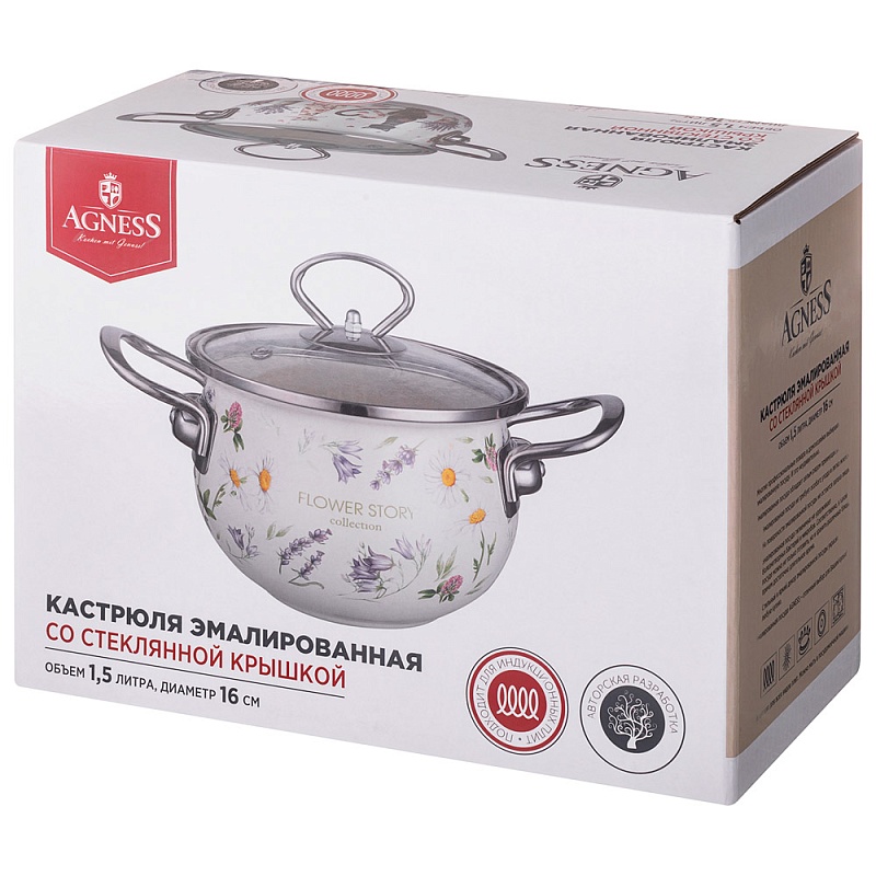 КАСТРЮЛЯ AGNESS ЭМАЛИРОВАННАЯ СО СТЕКЛЯННОЙ КРЫШКОЙ СЕРИЯ FLOWER STORY 1,5 Л ДИА 16СМ 943-095 (6/1)