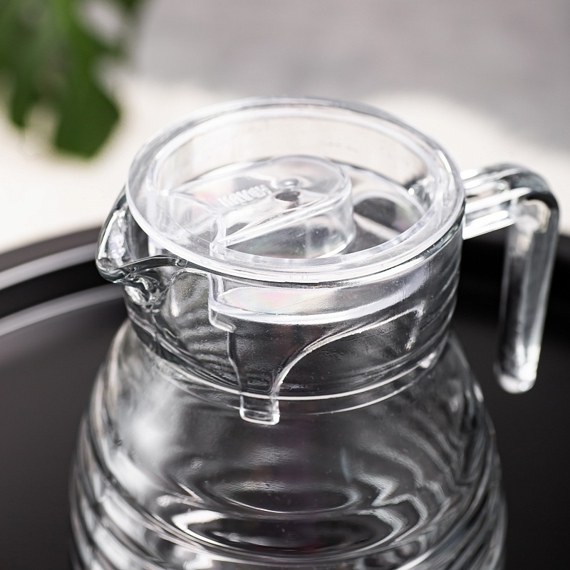 Кувшин стеклянный с плотной пластмассовой крышкой, емкостью 1.4 л., прозрачный , гладкий.