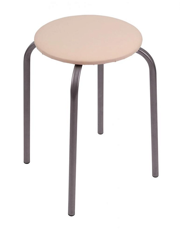 Табурет на 4-х опорах с мягким круглым сиденьем имеет габариты — 320х320х460 мм (до сиденья — 440 мм). Материал: каркаса — стальная труба диаметром 18 мм, сиденья — винилискожа, основания — древесная плита, колпачки на ножках — пластмасса. Легко штабелируются. Дополнительные особенности: материал сиденья прочный, устойчивый к истиранию и легкий в чистке. Допустимая нагрузка на табурет не более 100 кг. Цвет каркаса — серый, цвет сиденья — слоновая кость.
