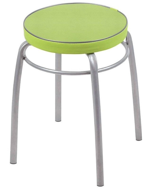Габаритные размеры — 340х340х460мм (ДхШхВ), 4 опоры, круг. сиденье d=320мм, высота до сиденья — 420мм; материал: каркас — стал. труба d=22мм, сиденье — винилискожа (мелкая шагрень), основание — древесная плита, колпачки на ножках — пластик; дополн. — метал. обод, усиливающий каркас; max нагрузка — 150 кг; цвет каркаса — серый, цвет сиденья — фисташковый.