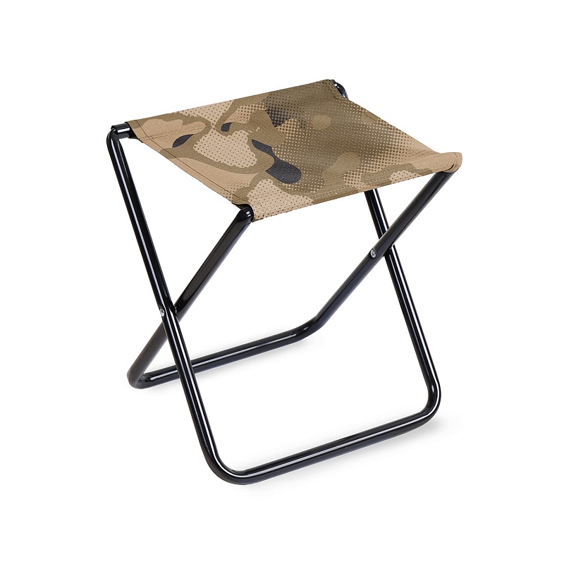 Размеры в сложенном виде — 470х350х40мм (ДхШхВ), размеры в разложенном виде — 350х300х370мм (ДхШхВ), размер сиденья — 300х300мм (ДхШ), высота до сиденья — 370мм; материал: каркас — метал. труба, чехол — ткань с водоотталк. пропиткой; max нагрузка — 90 кг; цвет каркаса — черный, принт чехла — камуфляж коричневый.