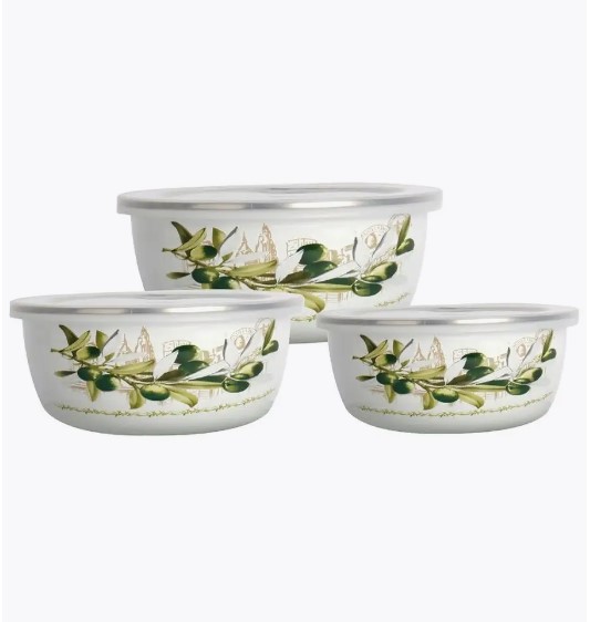 Набор мисок 6 предм 3 МИСКИ С КРЫШКАМИ: 0,7 Л d14 см 1,0 Л d16 см 1,7 Л d18 см с внутренним эмалированным покрытием эмалированная сталь внешнее покрытие - эмаль с рисунком Подарочная упаковка Z-80624-01 олива (12/1)Артикул: 115058Нет в наличии681 ₽