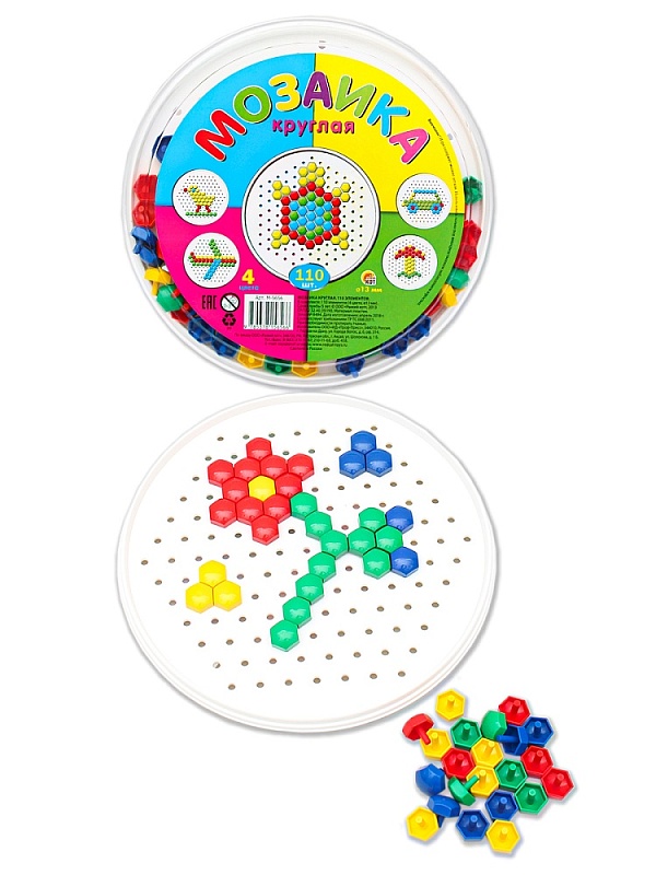 Состав набора (доп. реквизит): 1 планшетка, 110 элементов мозаики (4 цвета, диаметр 13 мм)
