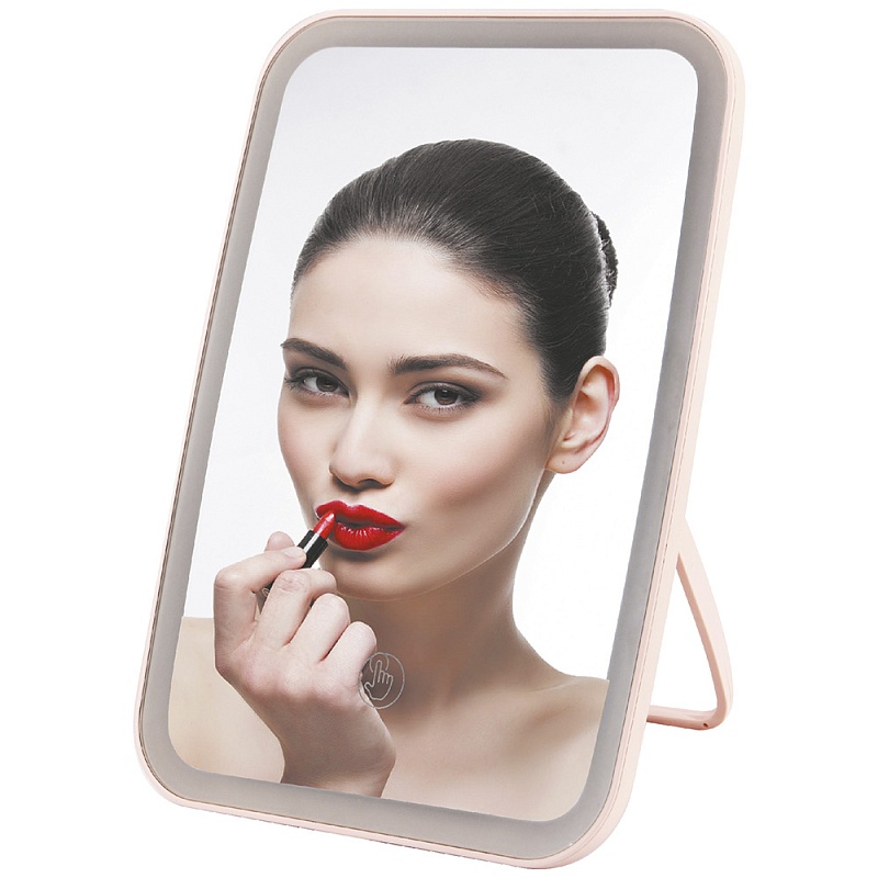 Зеркало для макияжа с подсветкой, размер: 23.8х16.8х2.5 см. Материал - высококачественный пластик. Регулировка угла наклона, 3 режима освещения (теплый, белый, естественный), сенсорная кнопка переключения яркости света, питание от USB кабеля 1200 мАч (входит в комплект).
