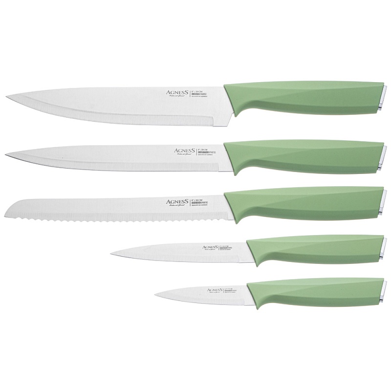 Состав набора: Нож поварской 20см, Нож для хлеба 20см, Нож для нарезки 20см, Нож универсальный 12,5см, Нож для чистки овощей и фруктов, 9см, Пластиковая разделочная доска, Пластиковая подставка для безопасного хранения ножей