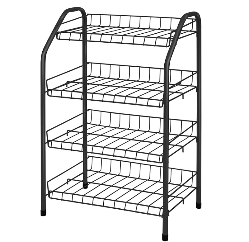 Этажерка для обуви с четырьмя полками имеет габариты в разложенном виде — 460х280х700 мм. Каркас выполнен из стальной трубы, окрашенной порошковой краской, которая усиливает устойчивость к механическим воздействиям. Допустимая нагрузка не более 20 кг. Конструкция этажерки разборная. Цвет — черный.