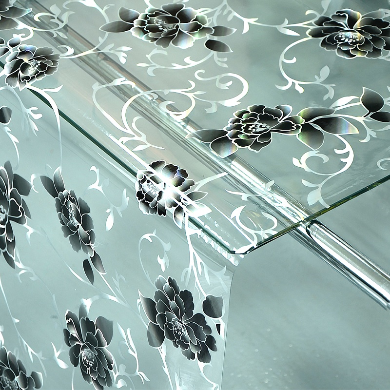 черные с серебром цветы на прозрачном фоне, прозрачная клеенка толщиной 0,65 мм, с лазерным рисунком, отлично подходит на стеклянные столы, термоустойчивая, плотная, эластичная.