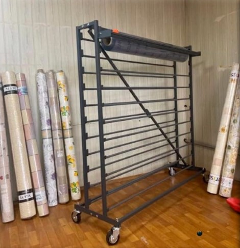 стенд для клеенки с резаком, предназначен для экспонирования рулонов клеенки шириной до 145 см, усиленные колеса диаметром 100мм, габариты стенда в собраном виде 1,66*1,55*0,5м, размеры упаковки 1,6*0,256*0,2 м (упакован в стрейч-пленку). Вес 36 кг