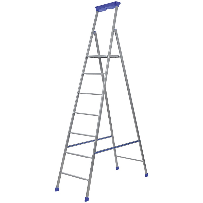 Металлическая стремянка с габаритами (в раскрытом виде) 500х1180х2065 мм имеет 7 металлических профильных ступеней 30 мм. Рабочая высота — 3710 мм. Есть лоток для инвентаря и отделение для инструментов, страховочная лента. Особенности: высокая удобная дуга безопасности, широкая безопасная площадка со встроенными вставками противоскольжения и рифленой поверхностью, облегченная конструкция стремянки. Максимальная нагрузка до 100 кг.
