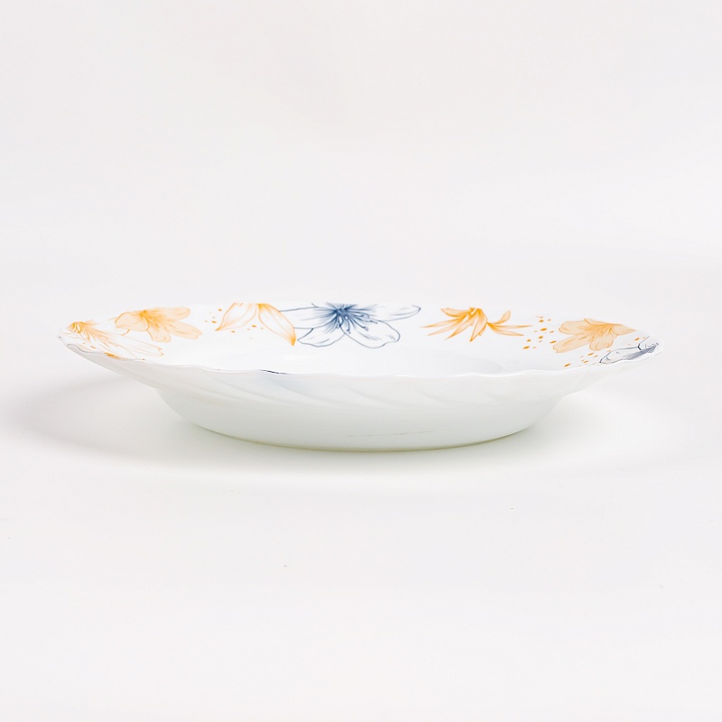 Тарелка изготовлена из опалового стекла, посуда из него одна из самых прочных и безопасных.