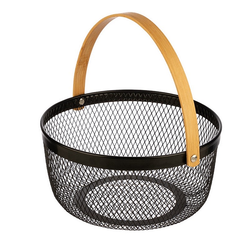 Корзинку удобно переносить благодаря деревянной ручке. Стальная сетка хорошо пропускает воздух, сохраняя свежесть продуктов.