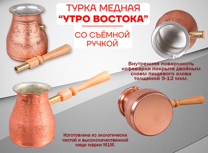 Турки торговой марки "ТimА" отвечают самым строгим требованиям экологической безопасности.Они изготавливаются на собственном производстве по самым передовым технологиям. Внешняя поверхность кофеварок "TimA" имеет натуральный цвет и блеск меди, не меняющийся в процессе эксплуатации. Это достигается использованием для защиты уникального английского порошкового жаропрочного лака.Турки торговой марки "ТimА" изготавливаются из листовой меди марки М1М (М2М). Корпус модели «Арабика» являются цельными и выполнены из меди толщиной 1.0 мм. Медь, по утверждению ученых, самый подходящий для приготовления пищи металл на планете Земля. Внутренняя поверхность турки покрывается пищевым оловом толщиной 9-12 мкм. Кофеварку можно использовать на газовых, электрических и стеклокерамических плитах.