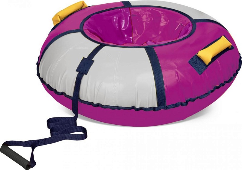 Тюбинг «Классик» баклажано-серебряного цвета имеет диаметр 95 см. Присутствуют защитный внутренний клапан с потайной молнией, буксировочный ремень, а также эргономичные усиленные ручки «оксфорд». Все швы усилены капроновой лентой с СВО. Верх и низ ватрушки — автотент ПВХ (550 гр/кв.м). Материал устойчив к морозам (25-28°С). Дополнительно в комплект идет камера.