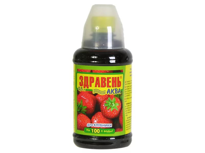 «ЗДРАВЕНЬ-АКВА» — жидкое комплексное органоминеральное удобрение для корневой и некорневой подкормки клубники в личных подсобных хозяйствах.