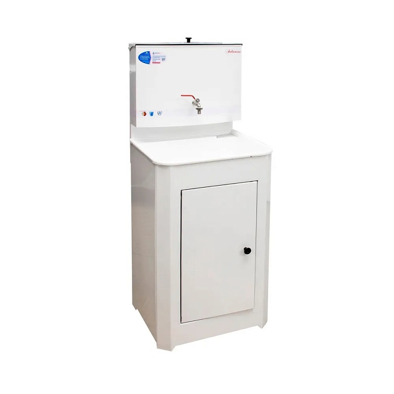 Умывальники «Акватекс» с габаритами 420х500х1260 мм приобретаются для дачи, гаража, мастерской или других мест без центрального водоснабжения. Умывальник выполнен из высококачественной стали и окрашен прочной краской. Раковина с габаритами 400х500 мм изготовлена из пластмассы. Конструкция умывальника сборная. Он состоит из тумбы, которая незаметно скрывает способ отлива воды и позволяет производить отвод воды даже в канализацию, и бака с металлическим шаровым краном. Объем бака — 20 л.