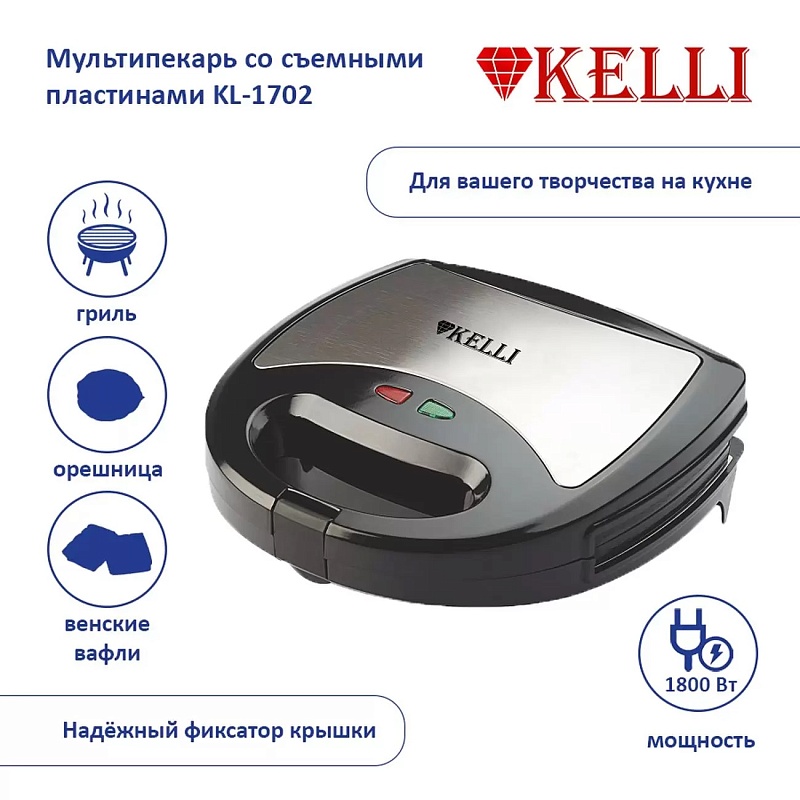 Вафельница-мультипекарь со съемными пластинами KELLI KL-1702 1800Вт ап/покр (4/1)Артикул: 101954В наличии2 083 ₽