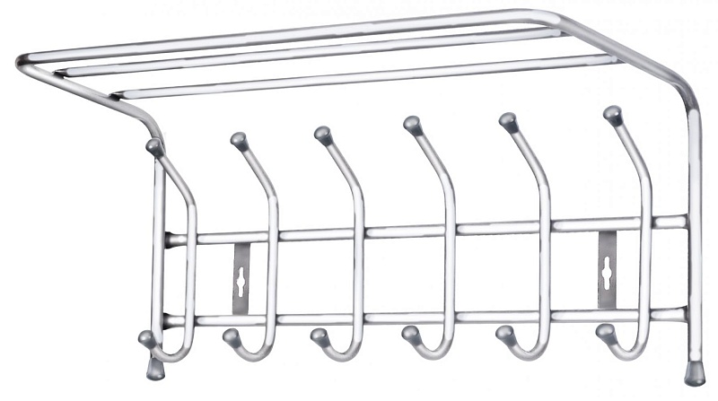 Настенная вешалка (6 крючков) для верхней одежды и головных уборов с полкой имеет габаритные размеры 605х265х245 мм. Каркас из стальной трубы с порошковым покрытием устойчив к механическим воздействиям. Наконечники изготовлены из пластмассы. Допустимая нагрузка на крючок не более 5 кг, а на само изделие не более 35 кг. Цвет — матовый белый.