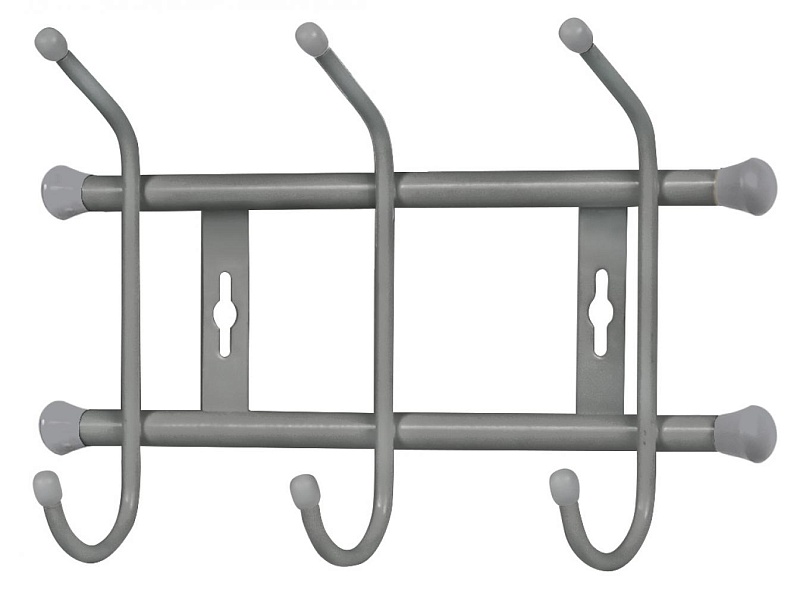 Настенная вешалка (3 крючка) для верхней одежды и головных уборов имеет габаритные размеры 285х180х67 мм. Каркас из стальной трубы с порошковым покрытием устойчив к механическим воздействиям. Наконечники изготовлены из пластмассы. Допустимая нагрузка на крючок не более 5 кг, а на само изделие не более 15 кг. Цвет — бежевый металлик.