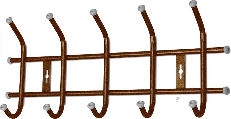 Настенная вешалка (5 крючков) для верхней одежды и головных уборов имеет габаритные размеры 485х215х85 мм. Каркас из стальной трубы с порошковым покрытием устойчив к механическим воздействиям. Наконечники изготовлены из пластмассы. Допустимая нагрузка на крючок не более 5 кг, а на само изделие не более 25 кг. Цвет — медный антик.