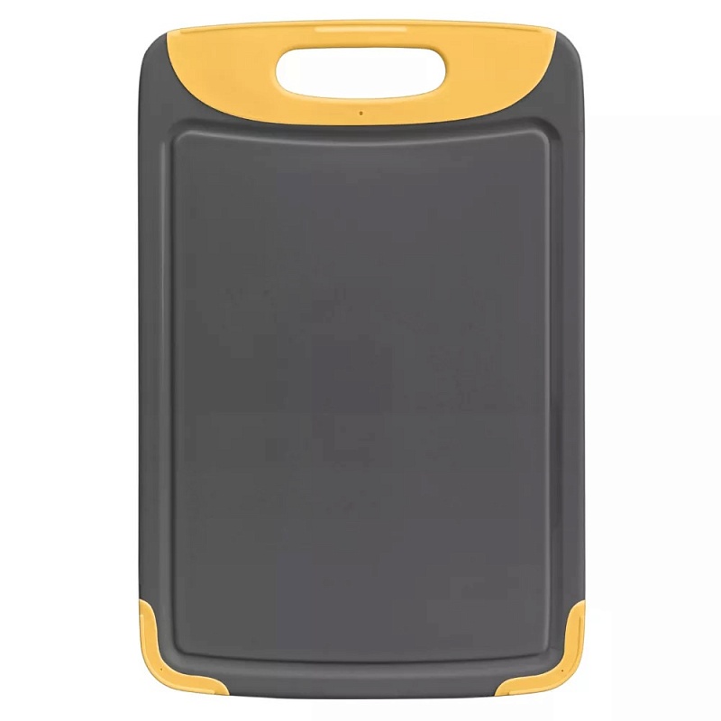 Удобная разделочная доска с увеличенной толщиной станет удачным приобретением для любой кухни. Доска не скользит по столу благодаря прорезиненным ножкам и имеет удобную прорезиненную ручку. Она не впитывает запахи и не тупит ножи; на ней можно резать фрукты, овощи, хлеб, сыр, колбасу, мясо и рыбу. Обе стороны разделочной доски являются рабочими, что продлевает срок службы изделия. Доска имеет желобок для сбора жидкостей, что позволяет избежать беспорядка на кухне. Легко моется, в том числе, в посудомоечной машине, изготовлена из безопасного материала. Доску легко хранить, подвесив на крючок за ручку, или разместив ее на подставке.