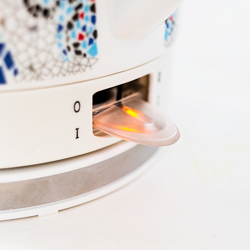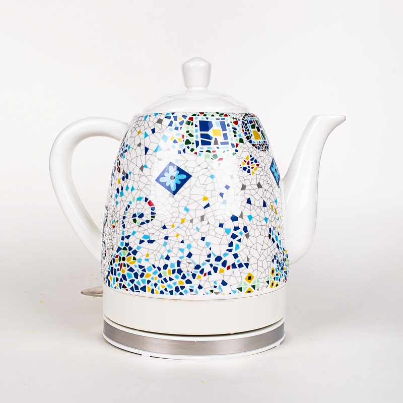 Керамический электрочайник на 1800 Вт имеет приятный внешний вид и станет прекрасным дополнением Вашего интерьера. Корпус чайника выполнен из керамики, что позволяет дольше удерживать тепло и реже его нагревать, что экономит электроэнергию. Модель поддерживает функцию автоматического выключения при отсутствии воды и при достижении водой температуры 100 градусов. Чайник может вращаться на подставке на 360 градусов, что позволяет ставить его с любой стороны, чтобы каждый член семьи мог полюбоваться изображением мозаики. Благодаря своей экологичности керамика гипоаллергенна, не выделяет налёт и легко моется как внутри, так и снаружи. С керамическим чайником качество воды повысится, и любимые напитки станут чаще Вас радовать, а специальная упаковка с пластиковой ручкой сделает его прекрасными подарком.