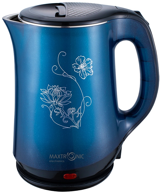 Корпус чайника с серебристым цветочными узором имеет двойные стенки: пластик синего и черного цвета снаружи и нержавеющая сталь внутри. Благодаря мощности 1500 Вт позволит быстро вскипятить до 2,3 л воды. Скрытый нагревательный элемент чайника позволит при необходимости легко отмыть корпус изнутри от загрязнений и накипи. Имеет встроенную систему отключения при достижении водой температуры 100 градусов, о чем оповестит световой индикатор. Благодаря свободному вращению на подставке прибор удобно брать и ставить на место любой рукой.