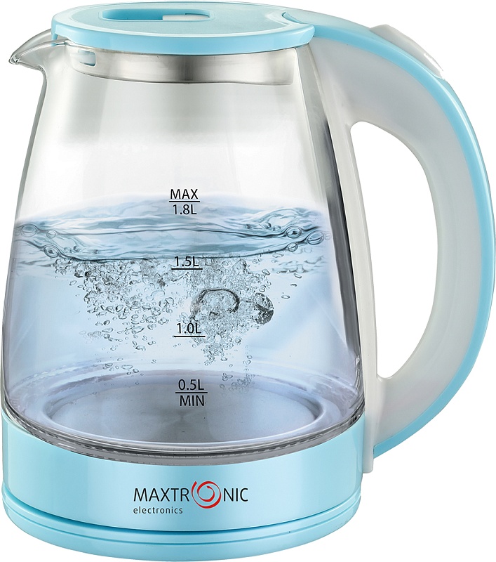 Электрочайник MAXTRONIC MAX- 206 хорошо впишется в обстановку и добавит Вашей кухне уюта. Благодаря мощности 1800 Вт позволит быстро вскипятить до 1.8 л воды, чего хватит на всю семью. Ручка и крышка выполнены из пластика в комбинации голубого и белого цветов. Корпус из термостойкого стекла позволит наблюдать полный процесс нагревания воды и ее оставшееся количество, чтобы вовремя наполнить его, а подсветка во время работы добавит чайнику оригинальности. Нагревательный элемент с покрытием из нержавеющей стали имеет закрытую конструкцию, благодаря чему при необходимости чайник можно будет легко отмыть изнутри от загрязнений и накипи. Прибор выключится автоматически при закипании, что обеспечит дополнительную безопасность в использовании.