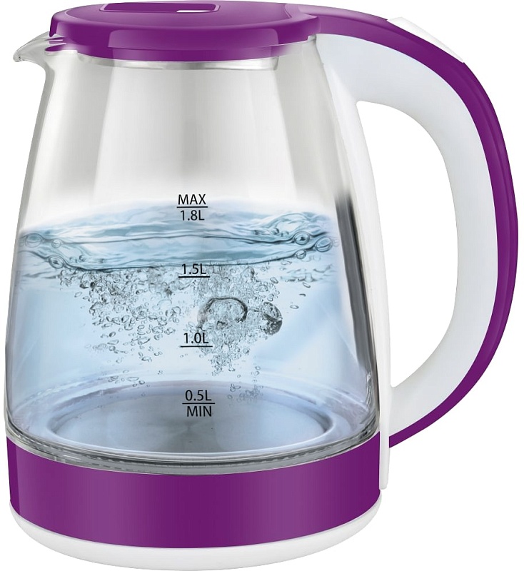 Электрочайник MAXTRONIC MAX- 411 с LED подсветкой хорошо впишется в обстановку и добавит вашей кухне уюта. Благодаря мощности 1800 Вт позволит быстро вскипятить до 1.8 л воды, чего хватит на всю семью. Ручка и крышка выполнены из пластика в комбинации фиолетового и белого цветов. Корпус из термостойкого стекла позволит наблюдать полный процесс нагревания воды и ее оставшееся количество, чтобы вовремя наполнить его, а подсветка во время работы добавит чайнику оригинальности. Нагревательный элемент с покрытием из нержавеющей стали имеет закрытую конструкцию, благодаря чему при необходимости чайник можно будет легко отмыть изнутри от загрязнений и накипи. Прибор выключится автоматически при закипании, что обеспечит дополнительную безопасность в использовании.