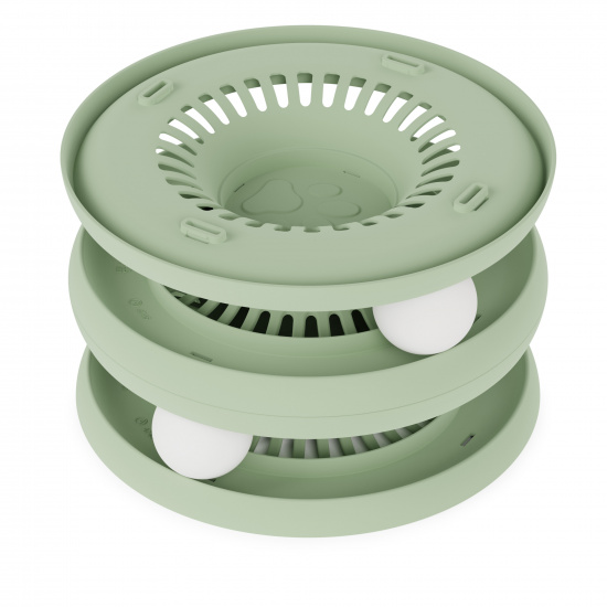 Трек представляет собой двухуровневую пирамидку с двумя шариками в комплекте. Когда кошка начинает играть с игрушкой, шарики начинают двигаться по треку. Она легко собирается и разбирается, занимает немного места и удобна в транспортировке. Эта игрушка не только сделает досуг питомца интереснее, но и поможет ему развить физическую форму и интеллект.