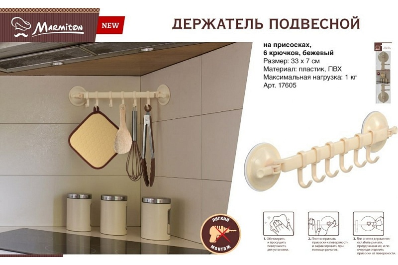 Держатель регулируемый подвесной на присосках пластик 6 крючков 33*7 см бежевый MARMITON 17605 (20/1) в Кирове