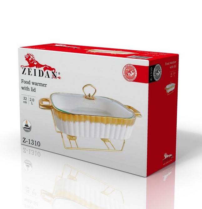 Мармит настольный с подогревом, материал – жаропрочная керамика с декором «под золото», 2,0 литра (32 см), металлическая подставка с двумя подсвечниками "под золото", крышка из жаропрочного стекла, предназначен для сохранения пищи в подогретом виде, подходит для использования в духовом шкафу.