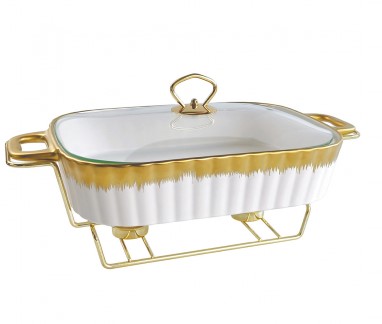 Мармит настольный с подогревом, материал – жаропрочная керамика с декором «под золото», 2,5 литра (38 см), металлическая подставка с двумя подсвечниками "под золото", крышка из жаропрочного стекла, предназначен для сохранения пищи в подогретом виде, подходит для использования в духовом шкафу.