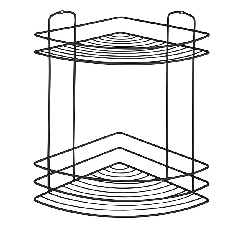 Полка угловая двухъярусная Размер: 21*21*30,5 см. Внешние прутья толщиной 3,5 мм. Внутренние прутья толщиной 2 мм. Цвет: черный. Крепление при помощи 2 шурупов или 2 крючков на самоклеящейся основе (в комплекте). Максимальная нагрузка: 3 кг. Материал: металл с порошковой окраской, ПВХ.