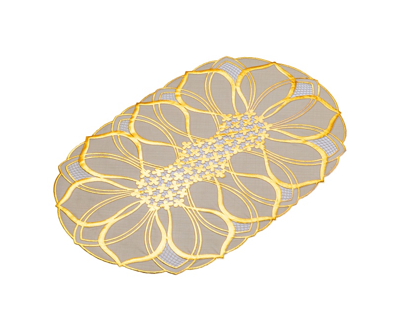 Салфетка для стола (30х46 см) кружевная с золотым напылением Лэйс Лайт из ПВХ без основы удобна в эксплуатации и является хорошим вариантом для практичной хозяйки, ведь она не только защищает стол, но также выполняет декоративную функцию.
