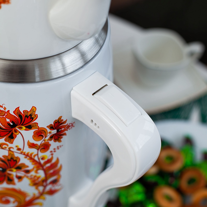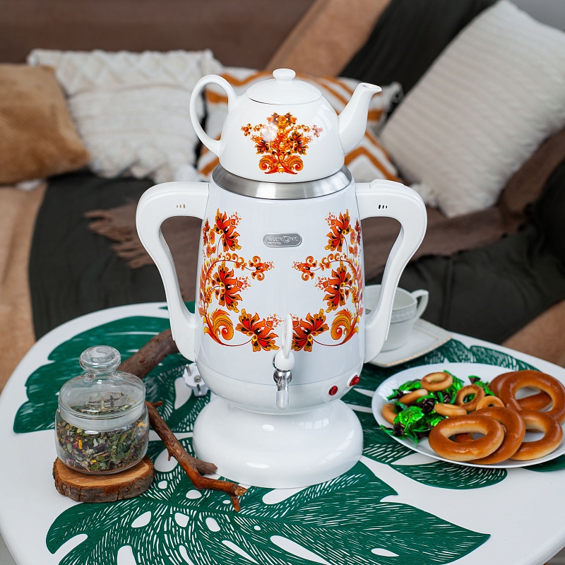 Электрический самовар в современном дизайне с росписью "Осень" добавит вашим чаепитиям атмосферу русских традиций и разнообразит интерьер кухни. Благодаря мощности 1800 Вт позволит быстро вскипятить до 3,5 л воды, чего хватит не только на всю семью, но и на гостей. Корпус чайника выполнен из керамики с колбой из нержавеющей стали, сверху установлен керамический заварочный чайник на 800 мл. Самовар оснащен функциями отключения при закипании, поддержания температуры и защитой от включения без воды. Легко моется, как внутри, так и снаружи.