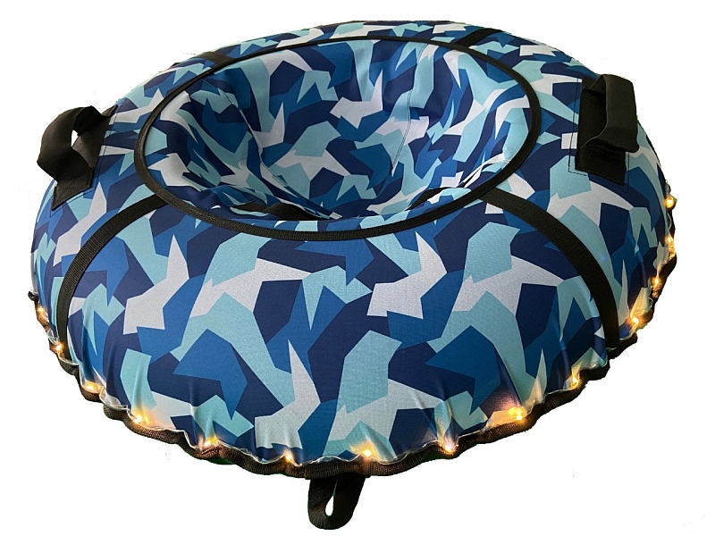 Тюбинг «Дизайн ЛЮКС с подсветкой» имеет диаметр 90 см. Оснащен камерой R13-14. Присутствуют защитный внутренний клапан с потайной молнией, а также мягкие ручки. Все швы усилены капроновой лентой с СВО. Верх ватрушки — оксфорд (600 гр/кв.м), а низ — тент (600 гр/кв.м). Дополнительная опция — подсветка. Принты в ассортименте.