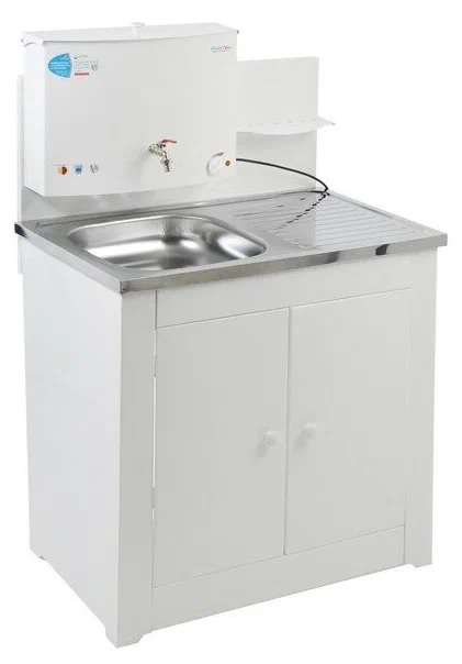 Умывальники «Акватекс» серии «Дуэт» с габаритами 420х930х1260 мм приобретаются для дачи, гаража, мастерской или других мест без центрального водоснабжения. Металлическая конструкция белого цвета проста в эксплуатации и уходе, обладает высокой износоустойчивостью. Раковина с габаритами 400х500 мм выполнена из нержавеющей стали, а на бак для воды нанесено запатентованное устойчивое к коррозии покрытие. Номинальный объем бака — 17 л. Умывальник данной серии поставляется с более широкой тумбой, зона мойки предусматривает дополнительное место для сушки посуды или помытых овощей и фруктов. Преимущества данной модели: