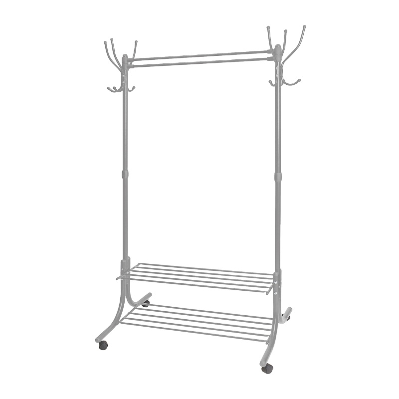 Гардеробная вешалка (6 крючков по бокам) для размещения верхней одежды и головных уборов с полками имеет габаритные размеры 1160х765х1740 мм. Каркас из стальной трубы с порошковым покрытием устойчив к механическим воздействиям. Колеса и наконечники изготовлены из пластмассы. Верхняя штанга предназначена для размещения плечиков для одежды, две полки — для обуви. Колеса предназначены для удобного перемещения вешалки. Допустимая нагрузка на крючок не более 10 кг, а на само изделие не более 20 кг. Цвет — матовый серый.
